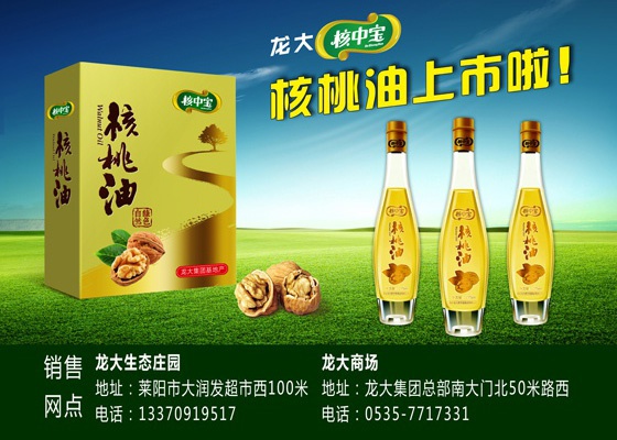龍大“核中寶”核桃油上市了。核中寶核桃油精選龍大自有基地生產(chǎn)的核中寶核桃,嚴(yán)格按照龍大蔬菜基地“五統(tǒng)一”管理模式進行管理、生產(chǎn),綠色、安全、健康、營養(yǎng)。
